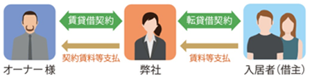 転貸借契約の場合、貸主として弊社が入居者と転貸借契約を締結入居者が居住する期間(無期限)で、家賃をお支払いします。